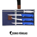 Zoro Forgas 4 piece professional boat knife set including flexible fillet and boning knives, 12" sharpening steel and heavy-duty canvas wrap for fishing and seafood processing.
