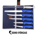 Zoro Forgas 6 piece professional boat knife set including fillet, boning and skinning knives, 12" sharpening steel and heavy-duty canvas wrap for fishing and seafood processing.
