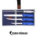 Zoro Forgas 4 piece professional boat knife set including fillet, boning and barra skinner knives, 12" sharpening steel and heavy-duty canvas wrap for fishing and seafood processing.
